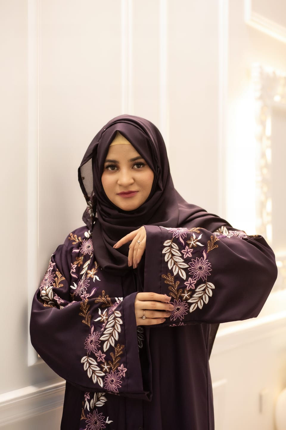 Grace and sophistication come together in this stunning purple floral embroidered abaya, crafted from high-quality Chinese Nida fabric for a soft, smooth, and breathable feel.