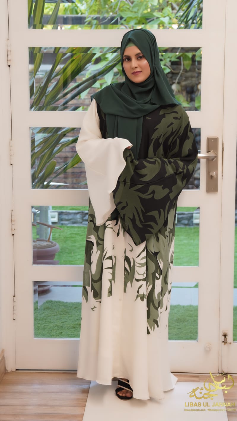 Elevate your modest wardrobe with this uniquely elegant camouflage print abaya, crafted from premium Dubai fabric known for its softness, breathability, and luxurious feel.