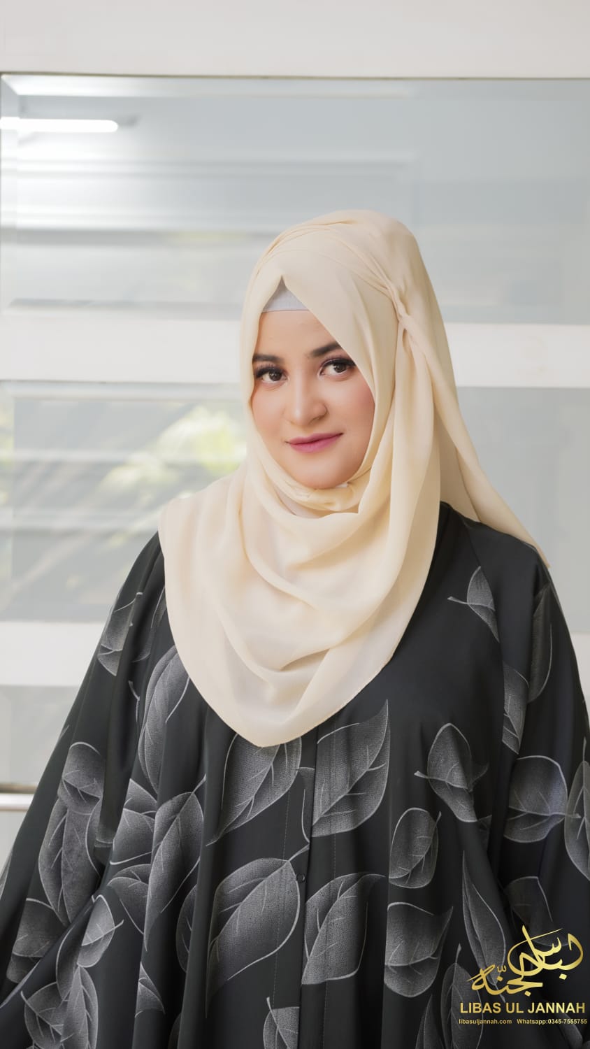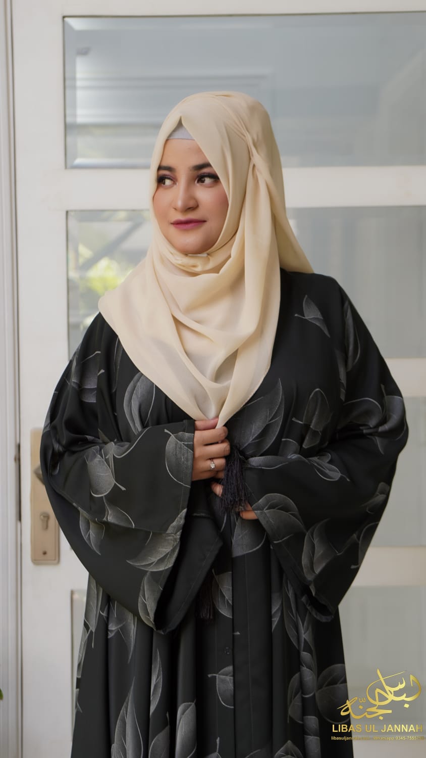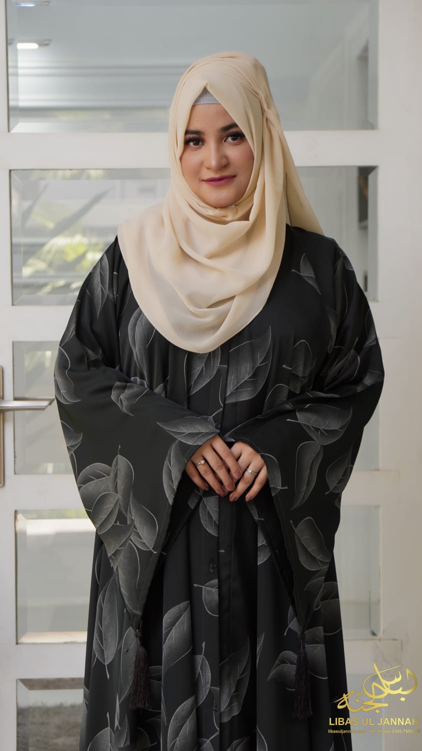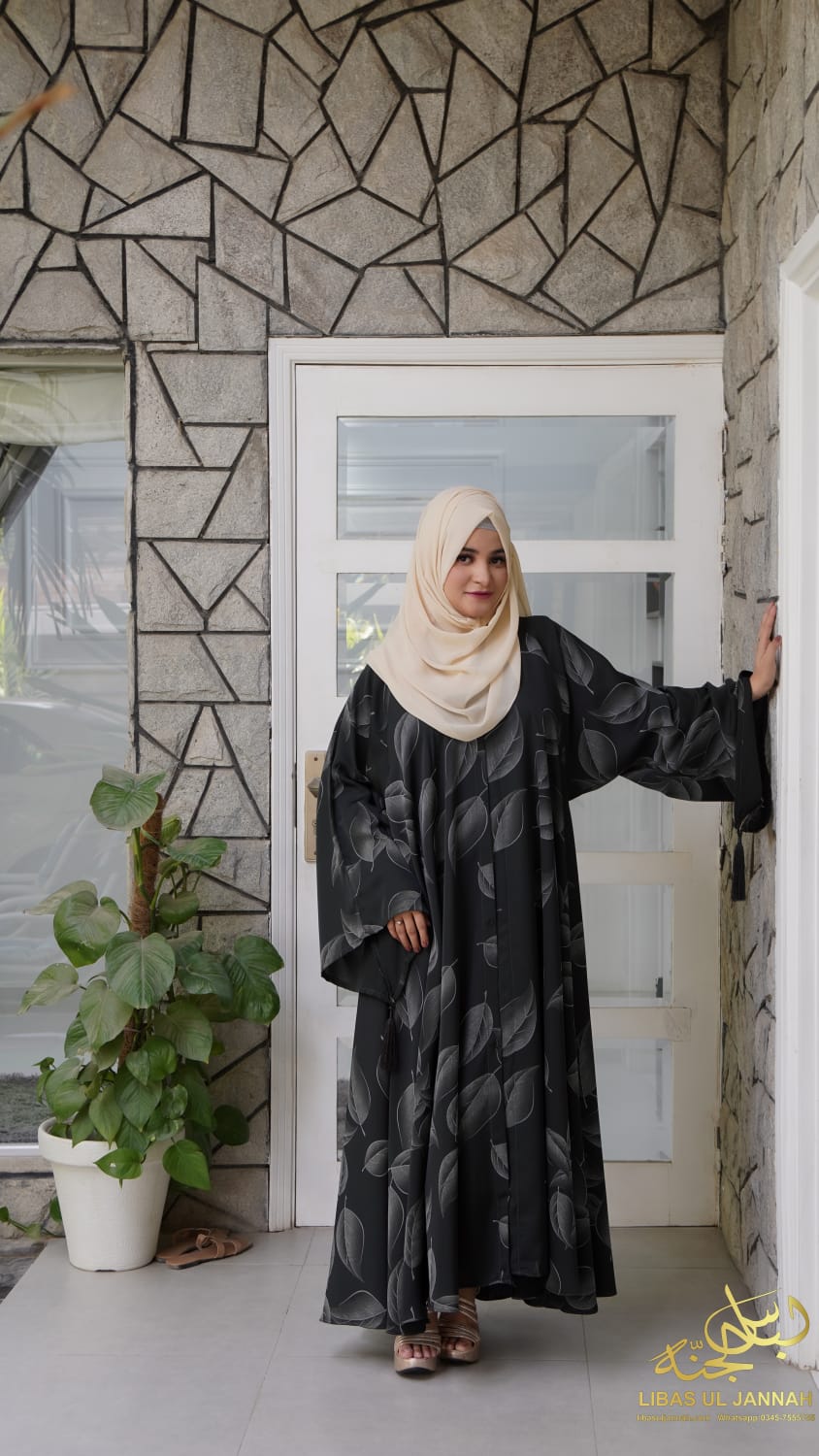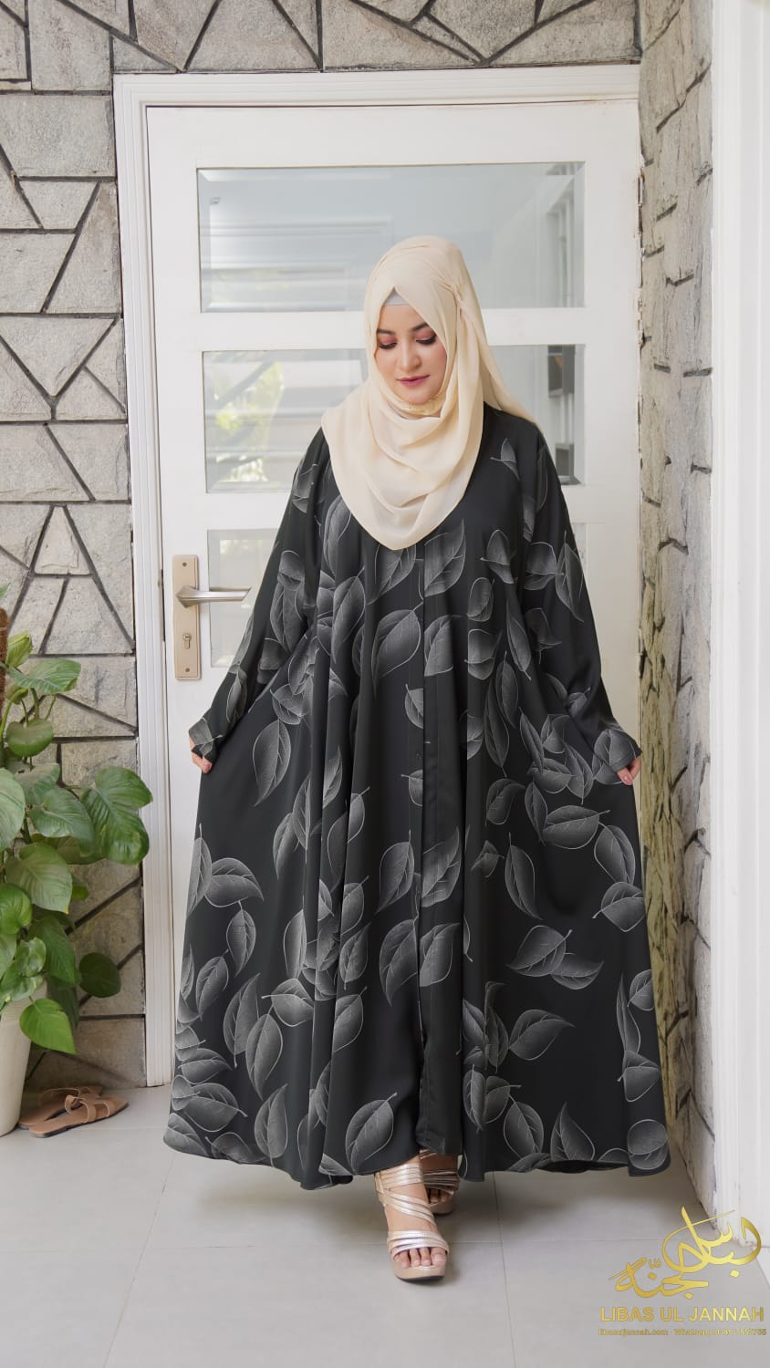 Inspired by nature, designed to flow — Layana is a stunning 3D leaf print abaya featuring a wide 180-inch airline-style gher that moves beautifully with every step. Crafted for elegance and presence, this abaya combines soft fabric with intricate 3D leaf printing, making it perfect for women who love statement modestwear with a graceful edge.