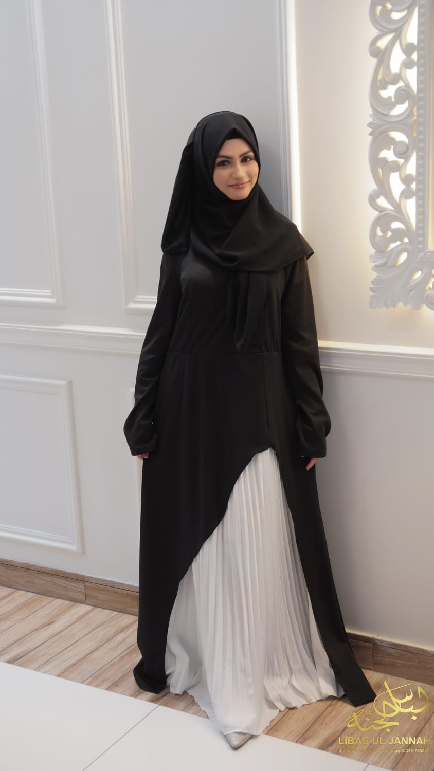 Modern, graceful, and effortlessly chic – the Abaya Salwa stands out with its unique designer cut featuring white pleated fabric panels on the sides. Crafted in China with attention to detail, this abaya blends classic black with striking contrast for a fashionable yet modest look.