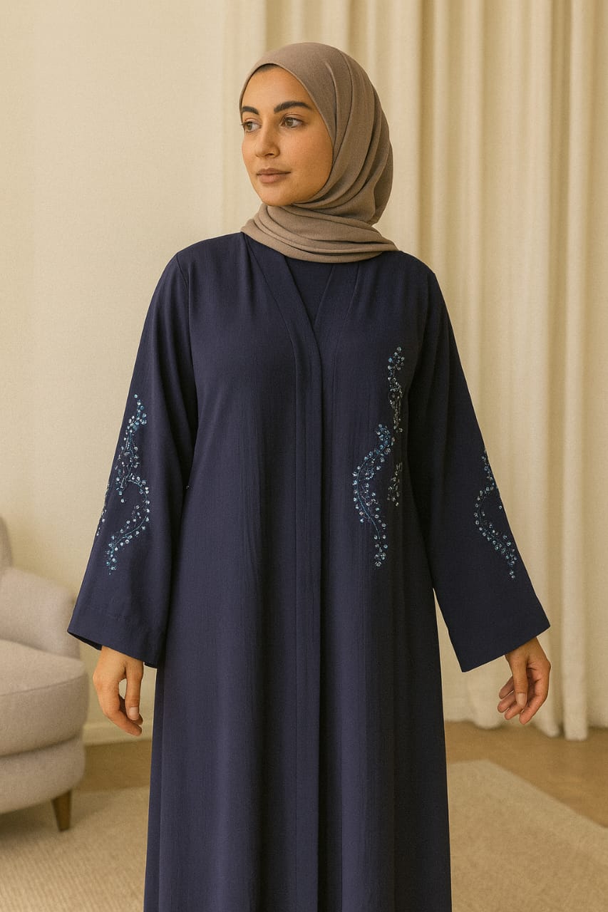 This beautiful abaya is crafted from premium Cey fabric, known for its soft texture and comfortable drape. The standout feature is the delicate handwork on the front and sleeves, adding a touch of elegance and charm. Its flowy silhouette ensures modesty with style, making it ideal for formal wear or special occasions.